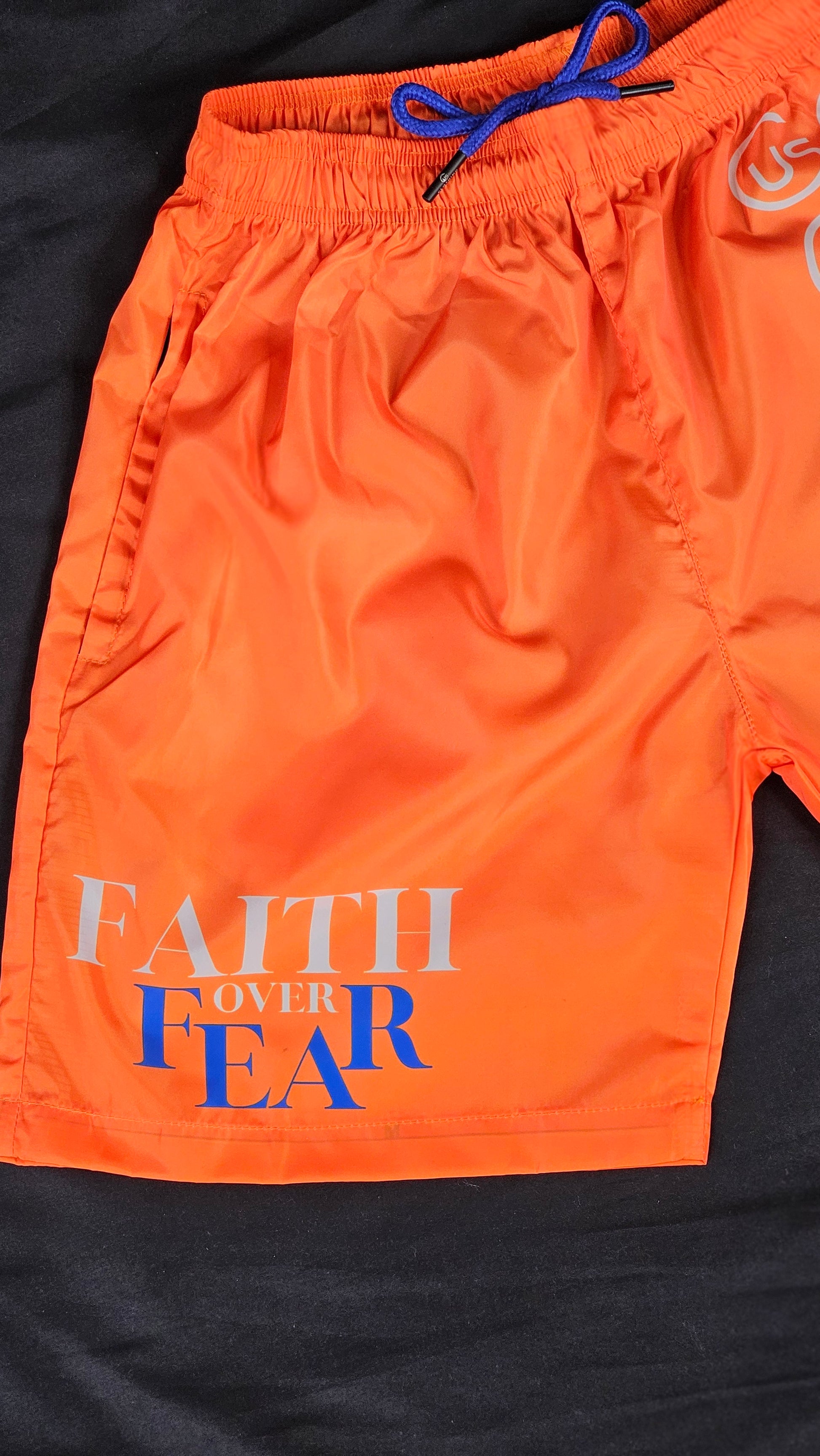 FAITH OVER FEAR SHORTS is a powerful reminder to lead with courage and conviction. Available in three standout colorways - classic black, bold orange, and clean white with "US" logo pattern on the right side to show we are not alone.
