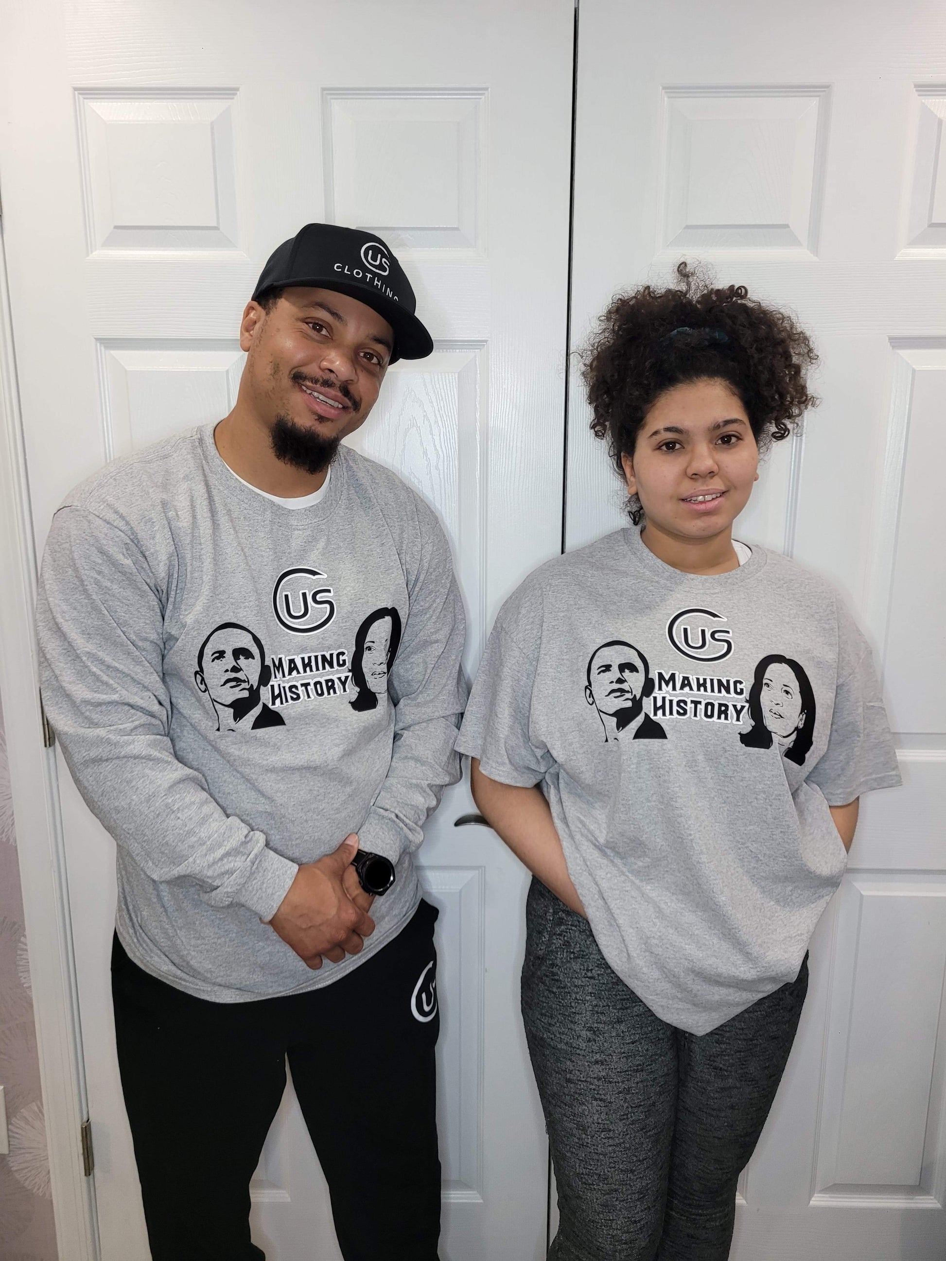 'Making History' T-shirt, featuring a powerful and inspiring design with Barack Obama and Kamala Harris on the front. This shirt celebrates their groundbreaking achievements and the significant impact they have had on American history. This T-shirt is a must-have for anyone who admires their legacy and contributions to society. Perfect for showing your support and pride in a comfortable and fashionable way."